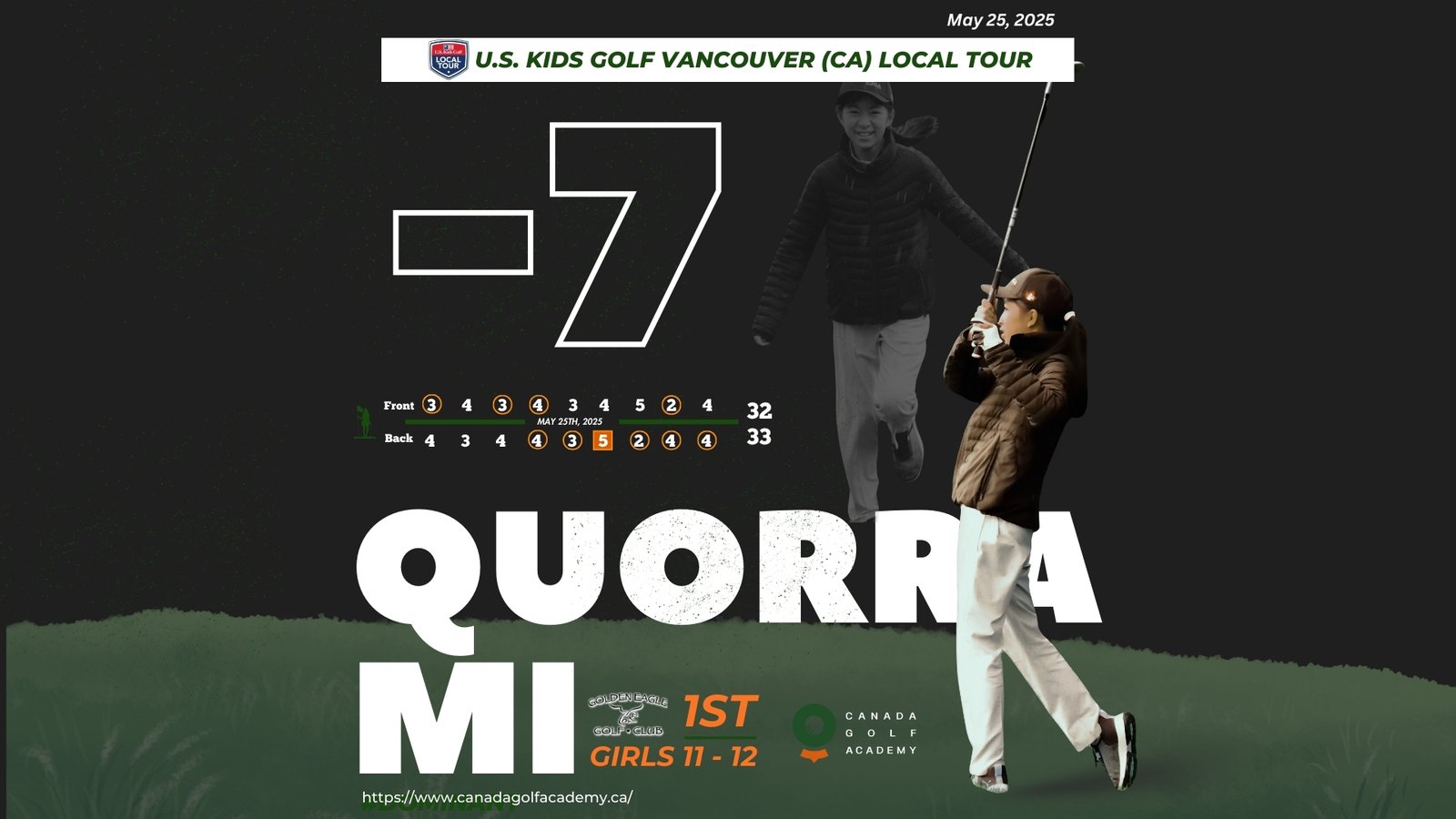 Richmond, BC – May 31, 2025 – Canada Golf Academy proudly congratulates Quorra Mi on her outstanding victory at the U.S. Kids Golf Vancouver (CA) Local Tour, held at Golden Eagle Golf Club.